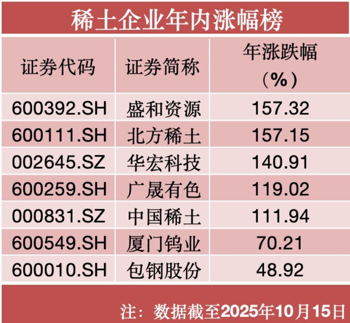 政策红利直接反映在市场表现上。10月9日,稀土板块单日大涨7.97%,10月13日再录得9.49%涨幅,北方稀土(600111.SH)、广晟有色(600259.SH)等5只个股年内涨幅均超110%,包钢股份(600010.SH)亦上涨48.92%。
