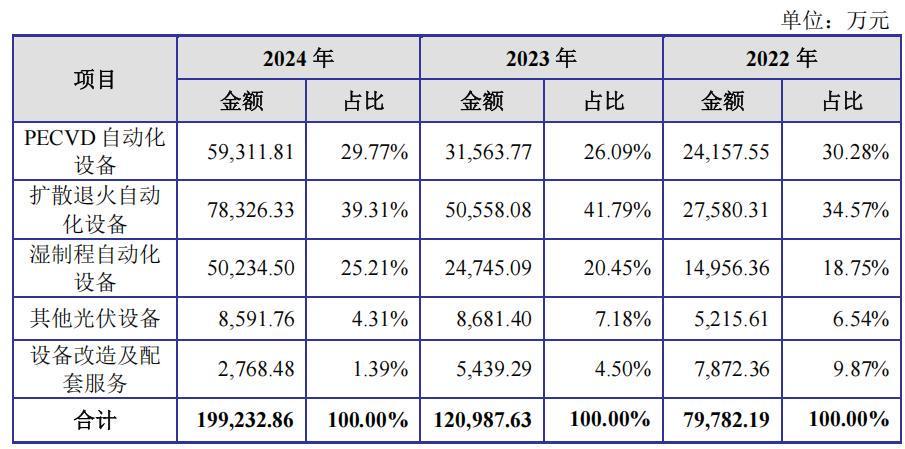 江松科技主要从事高效光伏电池智能自动化设备的研发、生产与销售,是国内光伏电池智能自动化设备领域的龙头厂商。公司主要产品包括光伏电池扩散退火、PECVD、湿法制程等工序的智能自动化设备和其他光伏设备,能够为客户提供智能、高效的全流程智能装备整体解决方案。受光伏生产厂商需求不断变化及光伏电池片生产技术更新迭代较快的影响,下游光伏生产厂商对自动化设备的技术要求不断提高。