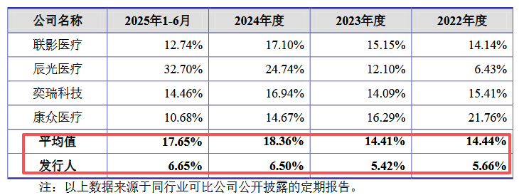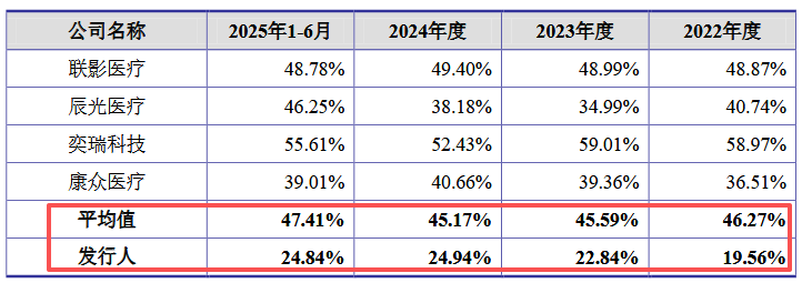 更令人关注的是,健信超导的毛利率长期低于同行。2022年至2024年以及2025年上半年,公司主营业务毛利率分别为19.56%、22.84%、24.94%、24.84%,而同期行业平均值则高达46.27%、45.59%、45.17%、47.41%。各期毛利率分别低于行业均值26.71个百分点、22.75个百分点、20.23个百分点、22.57个百分点,差距显著。