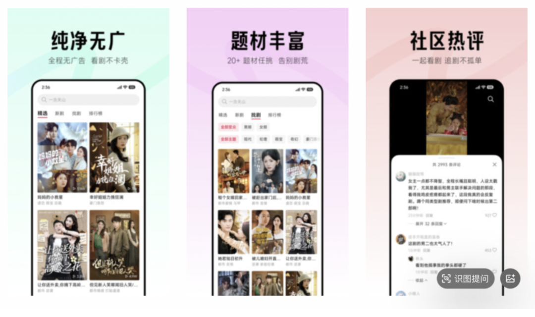 在内容方面,“围观短剧” 题材丰富,涵盖都市、逆袭、言情、复仇、总裁、家庭伦理等20余种常见类型,并设有榜单和评论区,增强用户互动与社区黏性。商业模式上,试图以无广告的观剧体验,建立差异化竞争优势。