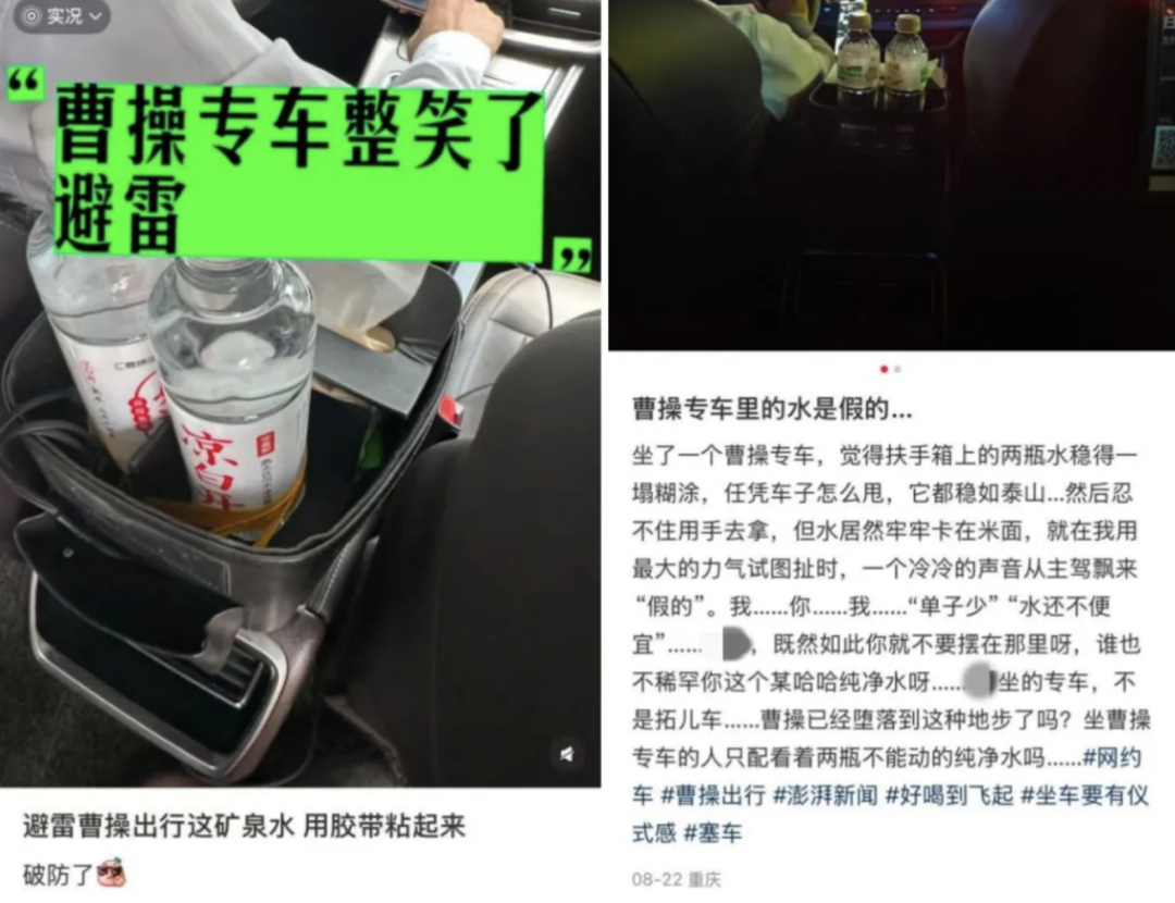 曹操出行则是少数仍坚持标配的平台之一,其在专车产品页上明确标注“免费饮用水、纸巾、充电线”为基础服务,但这部分成本却和其他平台一样,由司机自行承担。按平台单瓶约3元计,若司机日接25单需配水,单日成本约75元;即便按司机自称每瓶0.83元,日均也要约21元,在人均日入约357元(每小时35.7元、日工时10小时)的情况下,占比不低,直接引发司乘矛盾。