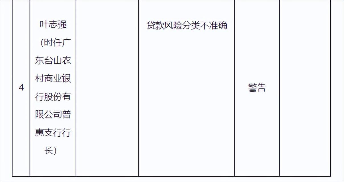 在此次处罚中,时任广东台山农村商业银行股份有限公司信贷风险管理部总经理的刘新艺,因其履职期间的相关责任,受到了警告处分。这一处分不仅是对其个人行为的警示,也是对金融机构内部管理责任的明确。