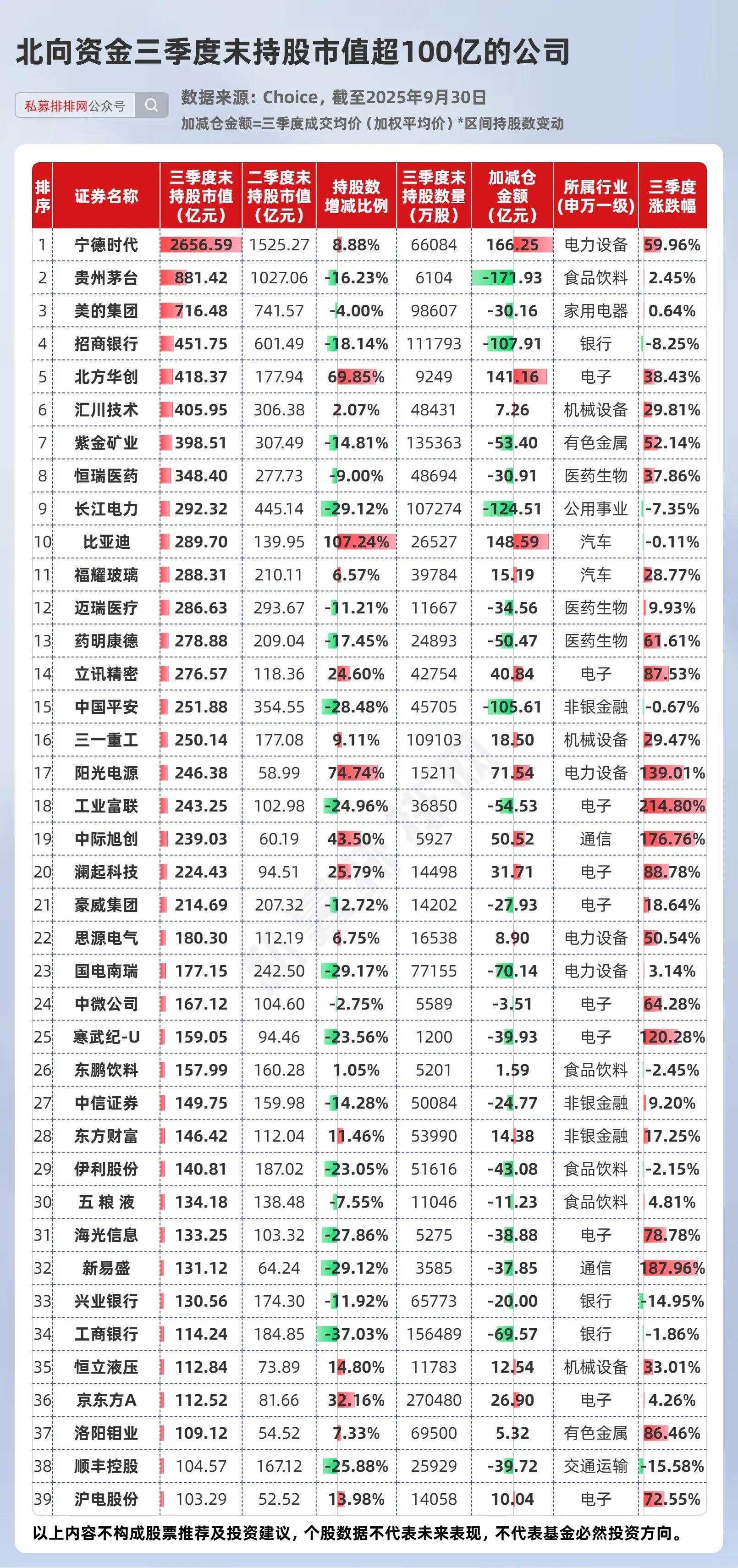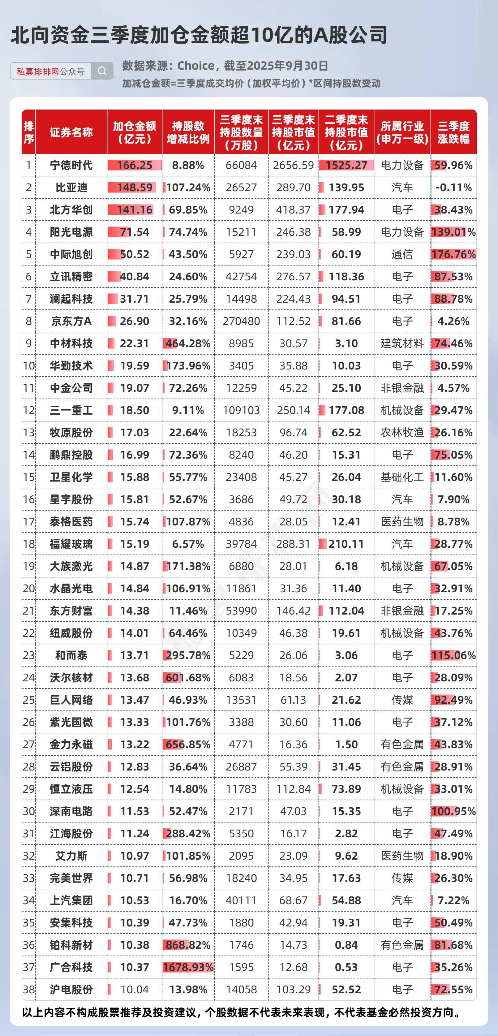 10月15日,北向资金2025年三季度的持股数据出炉了。北向资金是A股市场上“外资”的代名词,是A股市场上的重要投资者之一,由于历史上多次的成功操作,其被很多投资者奉为“聪明资金”,曾经的北向资金日内动向是很多投资者重要的参考指标。如今,北向资金持股数据改为季度更新后,其最新的季度持股动向备受投资者关注。