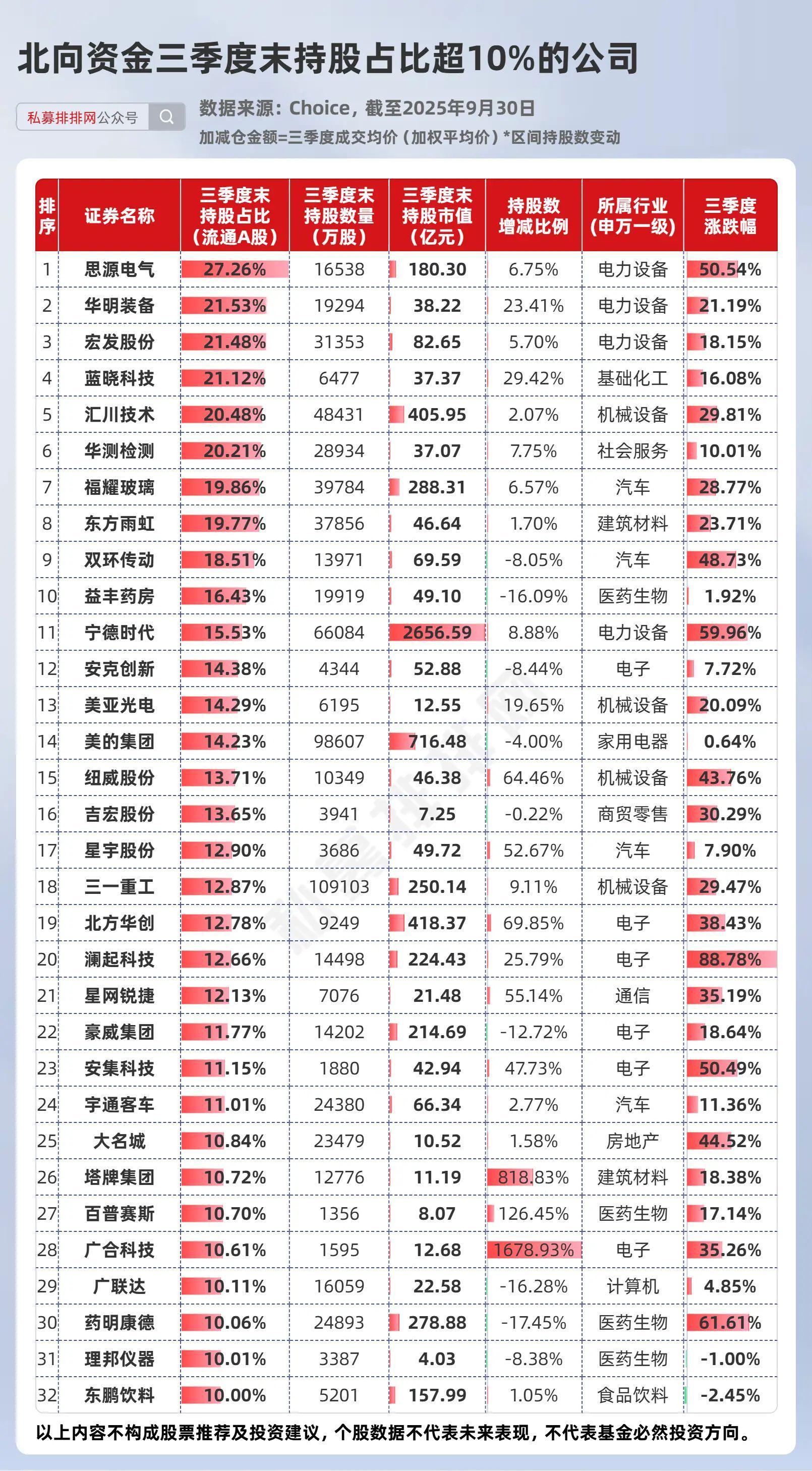从北向资金持股占流通A股的比例来看,2025年三季度末,北向资金持股占比超10%的公司有32家。其中,电子行业占6家,电力设备、汽车、机械设备、医药生物行业各占4家。