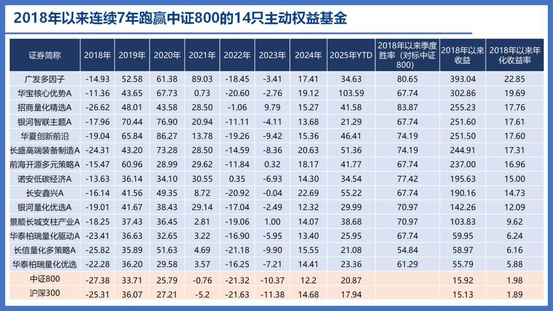 (数据来源:wind,2018.01.01~2025.09.30,宽基以中证800为比较基准,选取基金为:成立日早于2018年1月1日,样本池为万得开放式基金中的股票型基金及混合型基金中的偏股型基金、平衡混合型基金、灵活配置型基金,权益仓位超60%。)