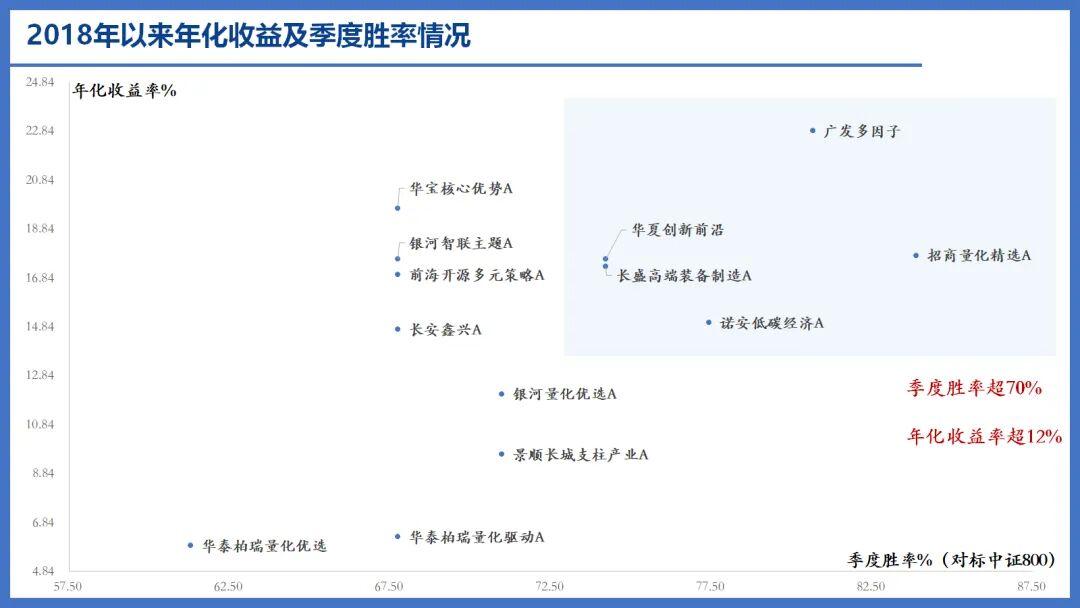 我们进一步缩小范围,在2018年以来累计收益跑赢中证800的14只产品中,筛选季度胜率超70%、年化收益超12%的产品,共筛出5只,分别为:广发多因子、招商量化精选(量化)、华夏创新前沿、长盛高端装备制造(大制造)、诺安低碳经济。