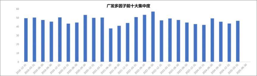 持股集中度方面,广发多因子的持股集中度始终维持在较低水平,前十大个股集中度整体保持在40%-60%区间,持股较为分散。