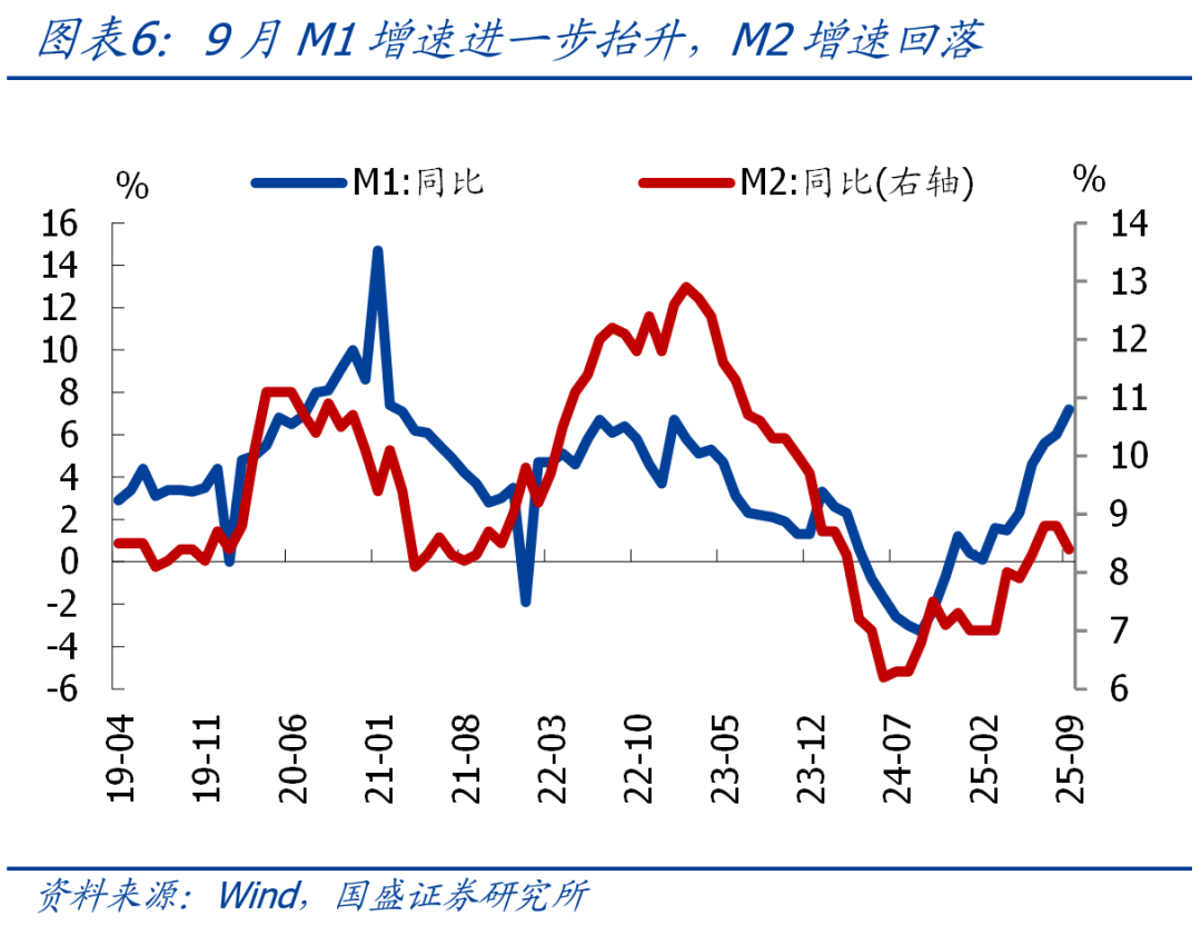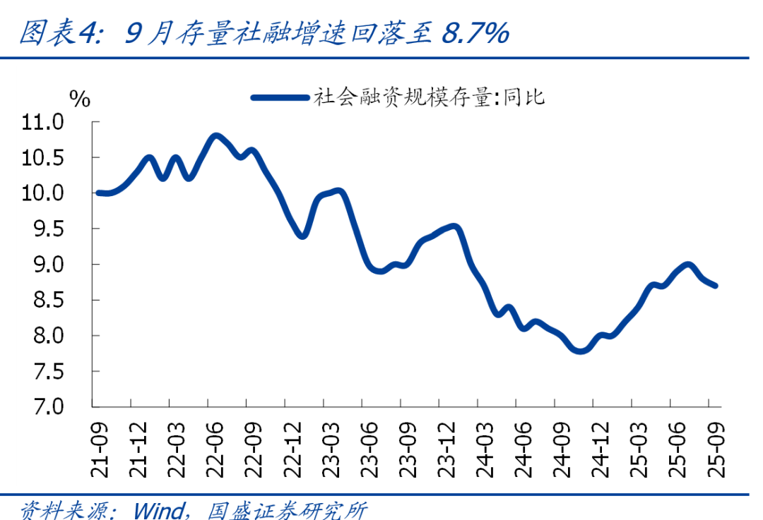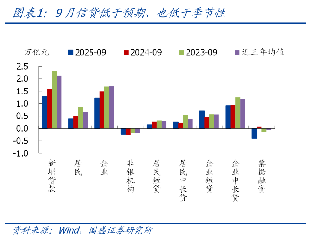 事件:2025年9月新增人民币贷款1.29万亿,前值5900亿,预期1.39万亿,去年同期1.59万亿;新增社融3.53万亿,前值2.57万亿,预期3.28万亿,去年同期3.76万亿;存量社融增速8.7%,前值8.8%;M2同比8.4%,前值8.8%;M1同比7.2%,前值6%。 核心观点:总量上,9月新增信贷、新增社融均低于季节性,存量社融增速进一步回落,主因政府债券支撑减弱,本质上还是需求不足。结构上,居民部门短期贷款同比降幅走扩,指向消费仍偏弱;中长期贷款同比多增,但主要是低基数支撑;企业票据冲量特征缓解,但短贷同比大幅多增,中长期贷款连续3个月同比少增,财政发力效果可能不及预期。值得注意的是,M1增速进一步升至7.2%,是2021年2月以来的最高水平,除基数回落外,居民存款活化可能是主要支撑,有望继续为市场带来增量资金,我们也继续提示:宏观环境依然是市场的好朋友,建议继续乐观点、乘势而上。往后看,鉴于当前经济回落有加速迹象,政策“适时加力”的必要性和可能性提升,宽松还是大方向,年内再降准降息可期。