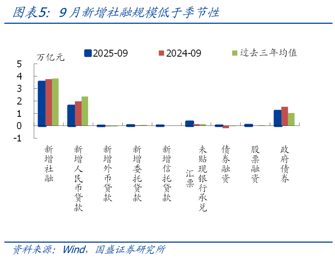 >结构看,9月社融口径人民币贷款新增1.61万亿,同比少增3662亿,是社融的主要拖累项。政府债券新增1.19万亿,同比少增3471亿,伴随政府债券逐渐发行完毕,叠加去年基数偏高,后续政府债券对社融的拖累将逐步加大。企业债券融资新增105亿,同比多增2031亿,主要也是与基数偏低有关。表外融资方面,表外三项增加3579亿,同比多增1869亿,表外票据多增是主要支撑,主要与票据冲量需求下降后、表外票据贴现至表内规模下降有关,与企业票据少增相对应。