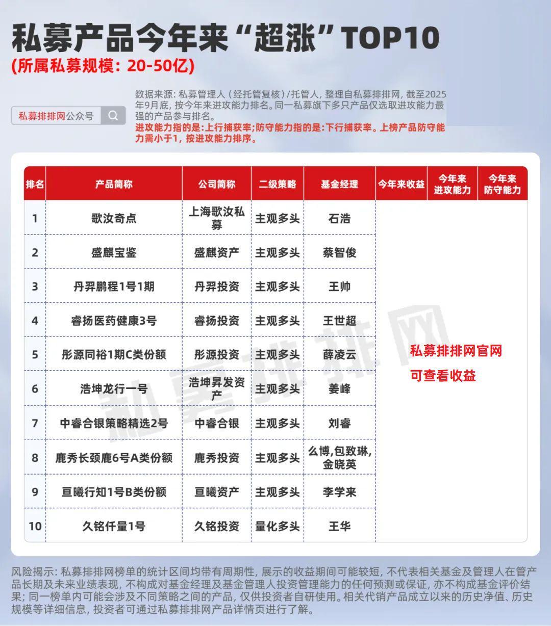 本文基于产品规模分类,筛选出前三季度进攻能力突出且防守能力优秀的十强私募产品(剔除债券与期货策略,同一机构仅保留进攻能力最强产品),供投资者参考。