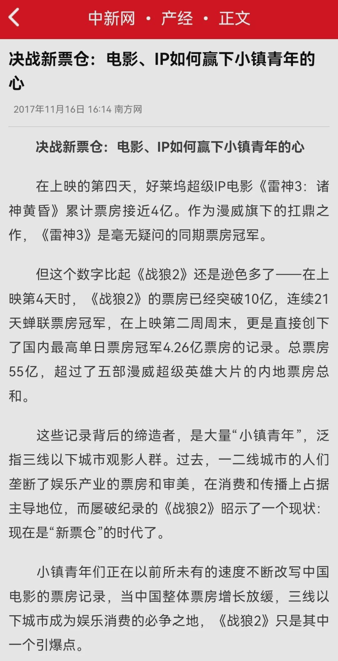 小镇青年也不负大厂众望,从2016年开始,三四五线城市的消费增速反超一二线城市。连电影市场都是靠2亿多的小镇青年撑起来的。2016年,电影市场神话破灭,连续五年保持40%以上的增长曲线突然断了。不过,眼尖的人还是发现了新的洼地——愿意为《美人鱼》《捉妖记》《战狼》掏腰包的,是同一帮人——小镇青年。