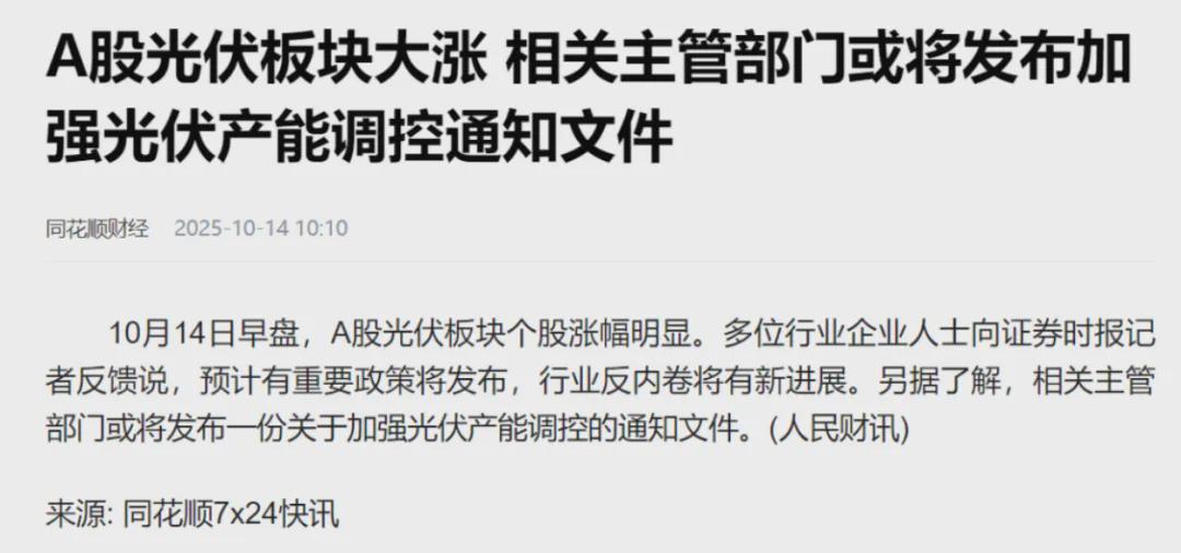 首先是国家层面出台了严禁新增产能的消息。据同花顺快讯引述证券时报报道,光伏行业反内卷将有新进展,相关主管部门或将发布加强光伏产能调控的通知文件。