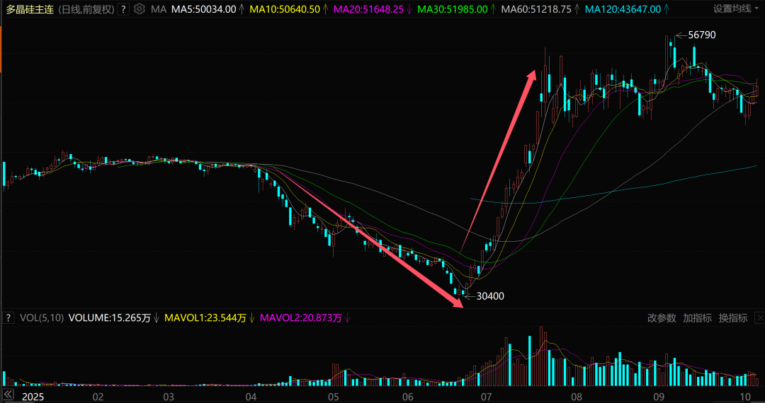 然而,随着6月底7月初国家层面出台一系列“反内卷”措施,尤其是聚焦光伏、新能源车等重点行业,依法依规治理企业低价无序竞争,推动落后产能有序退出,多晶硅期货价格开始强烈反弹。6月底到7月底,多晶硅期货从30000元附近涨至55000元以上,涨幅超过80%,彻底打爆了空头。