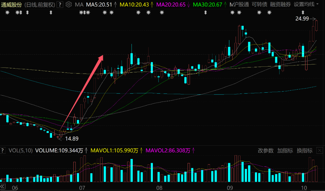 多晶硅价格的上涨也一度传导到光伏股。6月底到7月初,隆基绿能一度从14元附近涨至16元以上;通威股份更猛,一度从15元附近涨至22元附近。