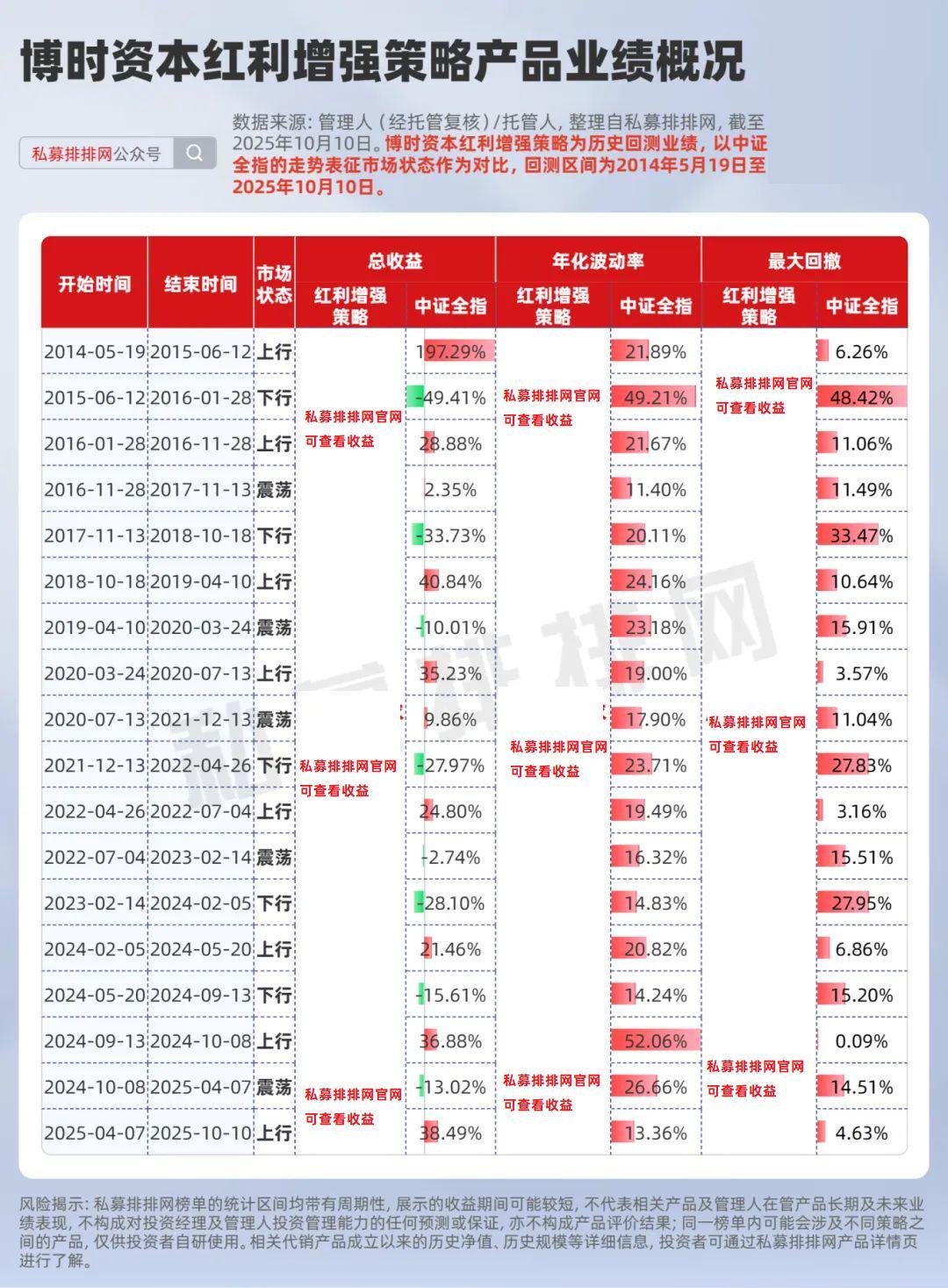 从历史走势来看,以中证全指的走势表征市场状态作为对比,博时资本红利增强策略在不同市场下的表现如下(回测区间为2014年5月19日至2025年10月10日):