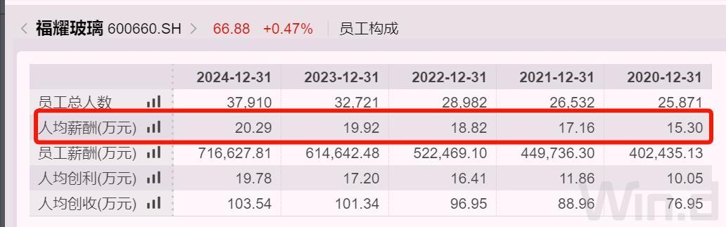 在股权结构方面,曹氏家族通过直接及间接方式持有福耀玻璃约16.3%股份。按公司最新1745亿元市值计算,对应市值达284亿元。高管薪酬方面,2024年曹德旺税前薪酬751万元居高层之首,曹晖为152万元,总经理叶舒(曹晖妹夫)薪酬342万元。公司员工待遇同样可观,2024年末职工总数3.8万人,人均税前薪酬20.3万元,较2023年增长3000元,较2020年增长5万元。