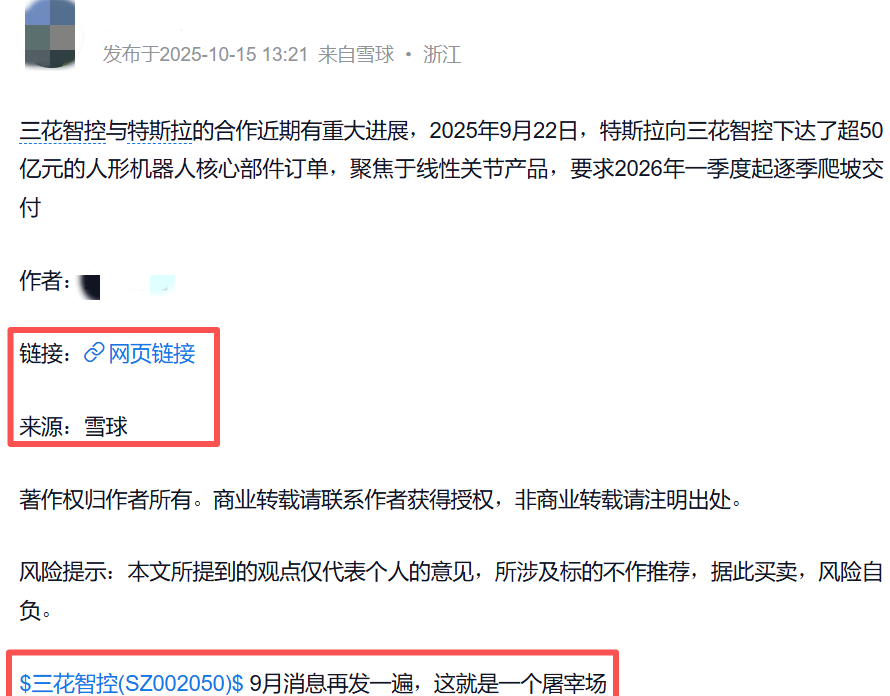 这场行情的导火索,源自当日发布于境外社交媒体X(原推特)的一则帖子。10月15日上午,ID为@tslaming的个人账号发帖称:“国内媒体报道称,特斯拉已向三花智控下达价值6.85亿美元(约合50亿元人民币)的大额订单,采购Optimus线性执行器,首批交付计划于2026年第一季度启动。”