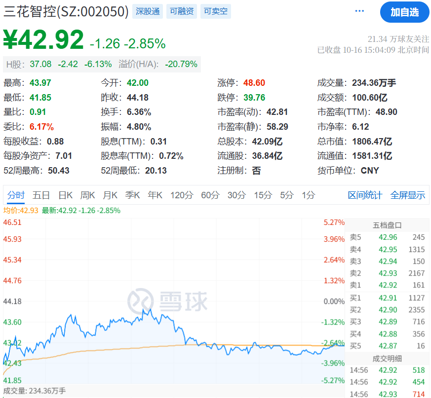 下午1点开盘后,三花智控A股与港股几乎同步拉升,A股涨停,港股一度涨超13%。截至当日下午股市收盘,三花智控A股收于44.18元/股,总成交额119.80亿元,总市值达到1859.50亿元;港股报39.52港元/股,涨幅高达12.98%,总市值为1646.31亿港元。