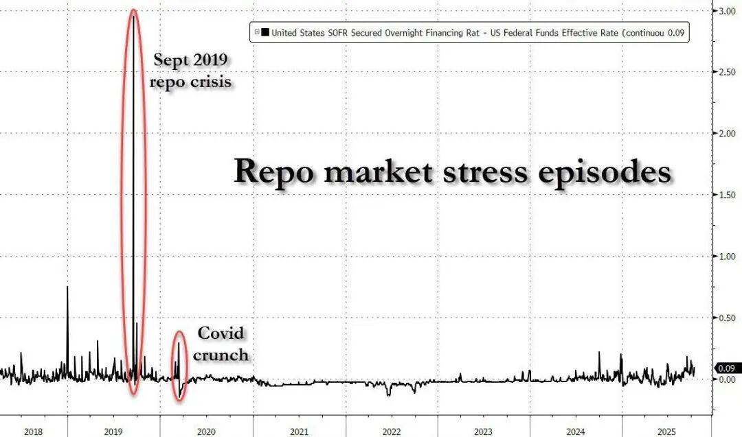 分析指出,准备金稀缺将直接冲击银行融资链,回购市场可能失灵,甚至引发系统性震荡。当前SOFR(担保隔夜融资利率)与联邦基金有效利率利差虽未达2019年极端水平,但已呈现扩张趋势。