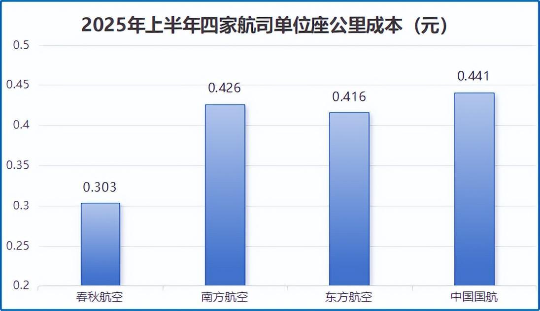 春秋航空从成立之初便定位于‘低成本航空’,单位座公里成本长期保持国内较低水平。2025年上半年,其单位座公里成本同比下降3.5%,达到0.303元,而三大航司的单位座公里成本均超过0.41元。
