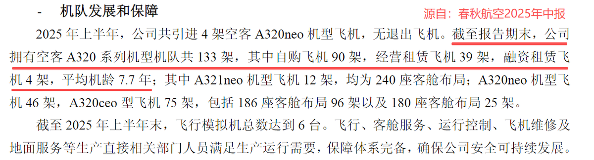 与多数航司采用多种机型不同,春秋航空的133架飞机(截至2025年上半年末)全部为空客A320系列。单一机型不仅降低了采购成本,还简化了飞行员和乘务员的培训流程。此外,春秋航空的飞机全部为经济舱,无头等舱和公务舱,可提供座位数较两舱布局的A320机型高10%-15%,进一步摊薄了成本。