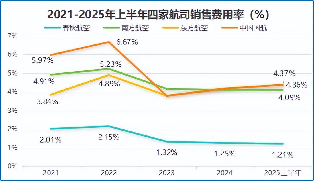 春秋航空早早打破了依赖中航信售票系统的传统,自建售票和离港系统,每年节省大量销售费用。2025年上半年,其电子商务直销占比达99.7%,销售费用率常年维持在1.5%左右,而三大航司的销售费用率普遍在4%以上。