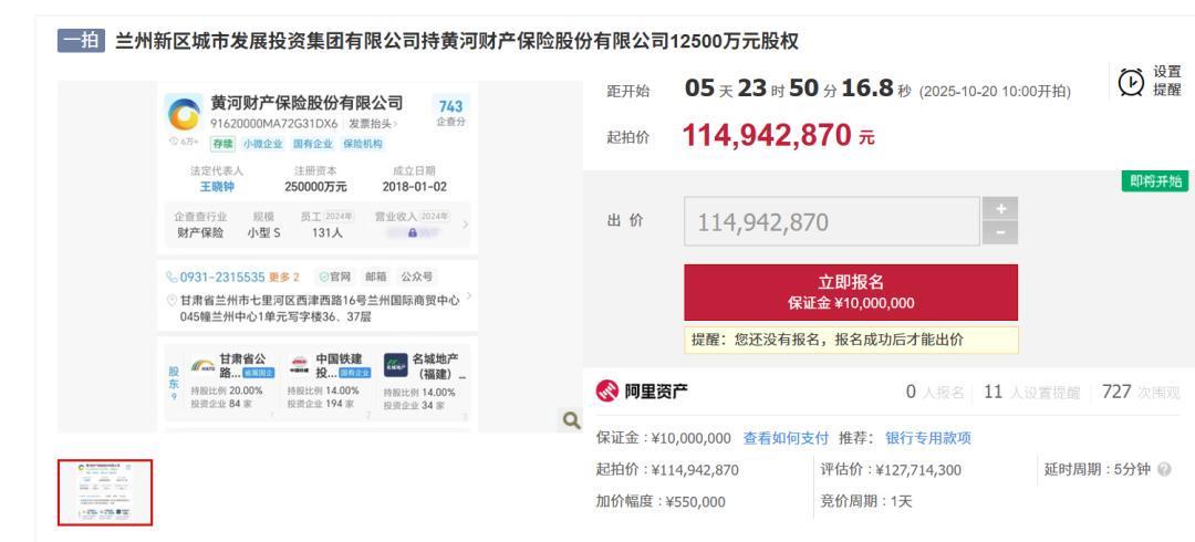 阿里资产拍卖平台显示,这1.25亿股股权起拍价定为1.15亿元,较市场法评估价折让10%。但收益法估值的骤降更具警示意义——评估机构基于企业未来盈利能力给出的价格,较市场法估值缩水84%,直接反映出市场对黄河财险持续经营能力的严重质疑。