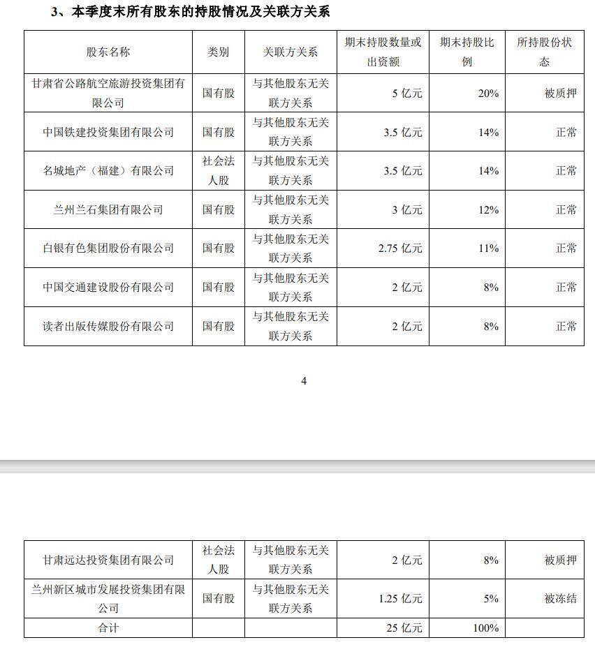 此次股权拍卖源于兰州新区城投的追偿权纠纷,但更深层的问题在于股东层面的系统性资金压力。截至2025年二季度,黄河财险九大股东中,第一大股东甘肃省公路航空旅游投资集团年内质押股权达29次,第八大股东甘肃远达投资更是质押了全部8%股权。
