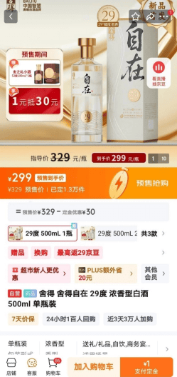 在销售端遇冷的同时,舍得酒业尝试通过产品创新寻找突破。今年8月,公司推出29度‘舍得自在’,定位‘轻饮生活’,首发现货选择京东平台,试图借助电商流量打造年轻化形象。官方数据显示,新品上线36小时内加购人数超2万,订单量超1.2万单,市场反响热烈。