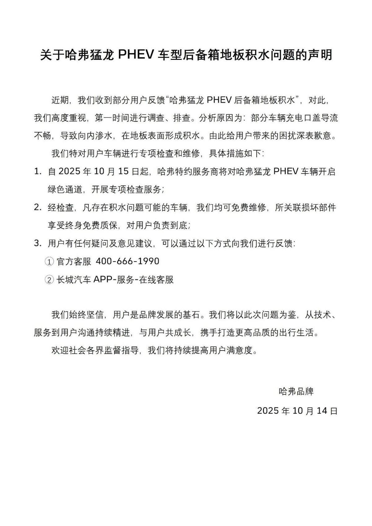 值得一提的是,10月14日,长城汽车旗下哈弗品牌就猛龙PHEV车型后备箱地板积水问题发布公开道歉声明,引发市场关注。声明指出,部分车辆因充电口盖导流不畅导致渗水,公司自10月15日起为受影响车主提供免费检查与维修,相关损坏部件享受终身质保。然而,声明未提及赔偿方案,引发消费者对安全隐患和车辆贬值的担忧。