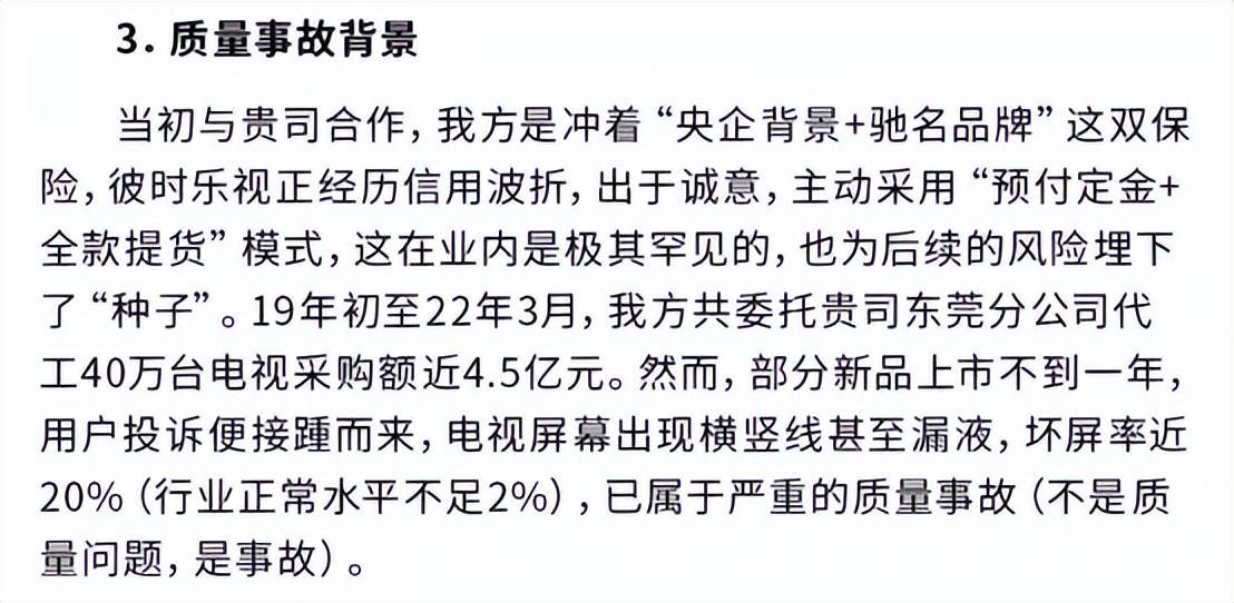 这场纠纷可追溯至2019年。当时乐视将电视生产业务委托给中电熊猫,采用"预付定金+全款提货"模式,累计合作金额达4.5亿元。但2020年起,由中电熊猫代工的Y43、F43及F55等型号电视集中爆发质量问题,坏屏率接近20%。更讽刺的是,该企业早在2016年就因产品质量不合格被国家质检总局通报。
