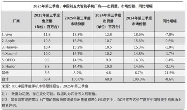 根据权威市场调研机构IDC的最新统计数据,2025年第三季度,荣耀以980万台的出货量排名第五,市场份额14.4%。由于出货比OPPO少了10万台,市场份额略微少了0.1%,差距极其微小。