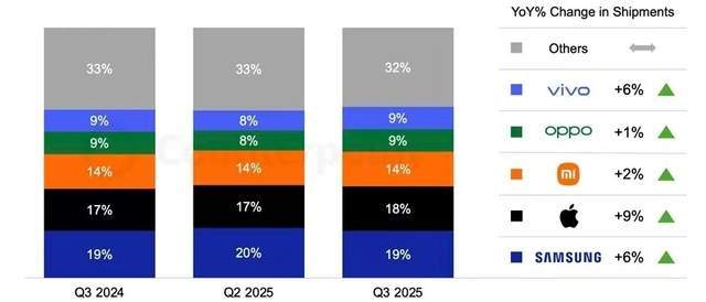 全球市场方面,来自权威市场机构Counterpoint最新(第一版)数据显示,2025年第三季度全球智能手机TOP 5分别为三星、苹果、小米、OPPO和vivo,荣耀仍然处在‘Others’里。