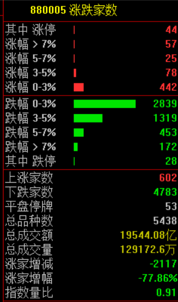 两市仅602只个股上涨,44只个股涨停,而4783只个股下跌,市场情绪极度悲观。
