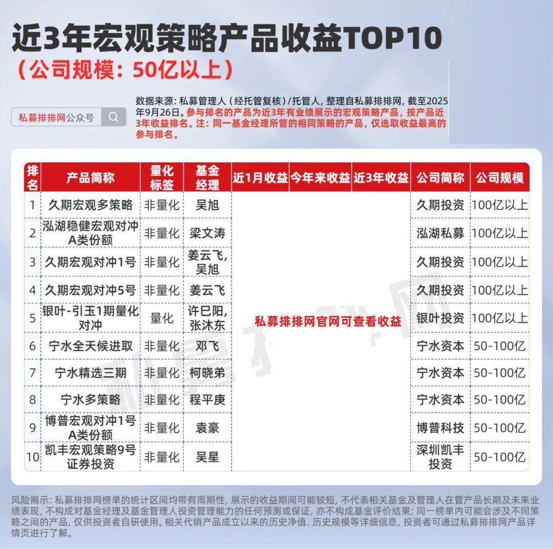 私募排排网数据显示,截至9月26日,50亿以上规模私募旗下有近3年业绩展示且符合排名的宏观策略产品合计21只,近3年收益均值为69.86%,收益前10的上榜“门槛”为***%。(应监管要求,私募产品不能公开展示业绩,文中涉及收益数据用***替代)