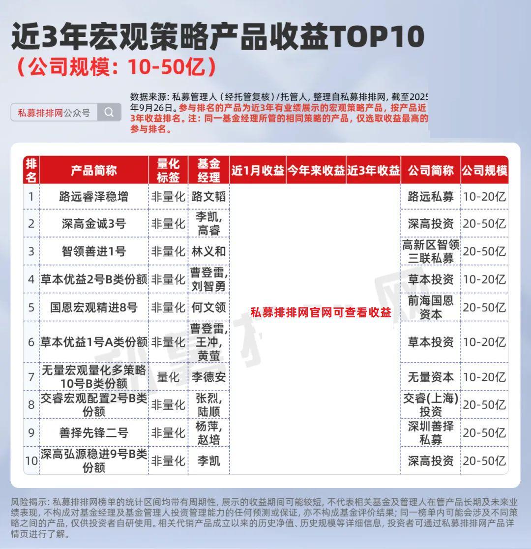 私募排排网数据显示,截至9月26日,10-50亿规模私募旗下有近3年业绩展示且符合排名的宏观策略产品合计27只,近3年收益均值为77.79%,收益前10的上榜“门槛”为***%。