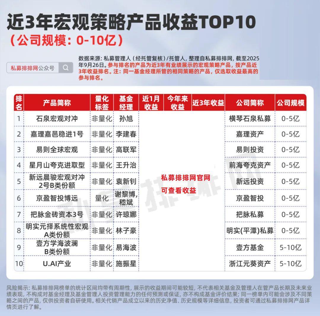 私募排排网数据显示,截至9月26日,0-10亿规模私募旗下有近3年业绩展示且符合排名的宏观策略产品合计43只,近3年收益均值为76.48%,收益前10的上榜“门槛”为***%。
