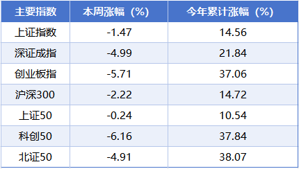本周(10月13日至10月17日),A股市场经历了显著调整,三大指数均出现不同程度的回调。截至周五收盘,上证指数累计下跌1.47%,深证成指累计下跌4.99%,创业板指累计下跌5.71%,市场整体呈现震荡下行态势。