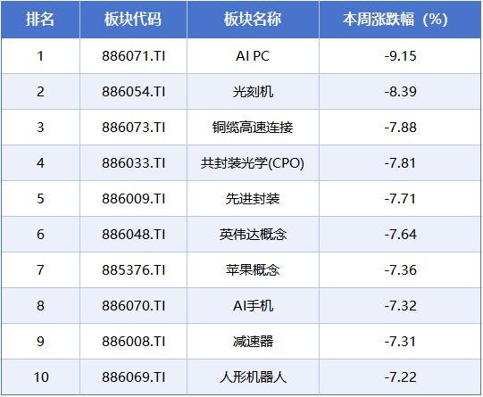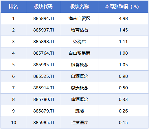 在板块方面,本周涨幅居前的概念板块分别是海南自贸区、培育钻石、免税店、自由贸易港、粮食概念,累计涨幅分别为4.98%、1.45%、1.11%、1.08%、1.05%。这些板块的上涨可能与政策利好、市场需求增长等因素有关。而排在跌幅榜前排的概念板块则是AI PC、光刻机、铜缆高速连接、共封装光学、先进封装,累计跌幅分别为9.15%、8.39%、7.88%、7.81%、7.71%。这些板块的回调可能与前期涨幅过大、技术面调整等因素有关。
