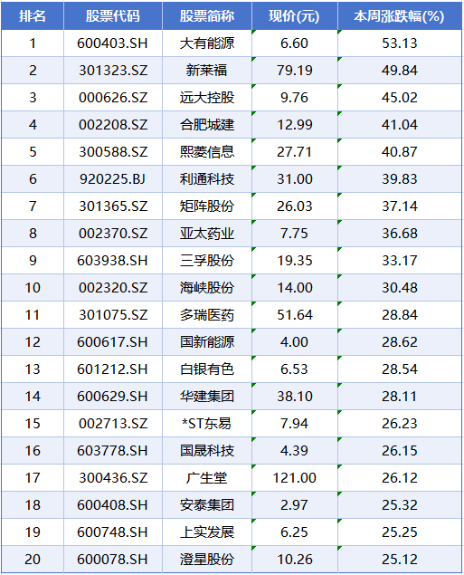 在个股方面,本周个股涨幅榜前五位分别是大有能源、新莱福、远大控股、合肥城建、熙菱信息,累计涨幅分别为53.13%、49.84%、45.02%、41.04%、40.87%。这些个股的上涨可能与公司业绩增长、行业前景向好等因素有关。其中,大有能源主要产品包括优质长焰煤、焦煤、贫煤、洗精煤等,广泛应用于发电、造气、工业锅炉、炼焦、建材等行业;新莱福是一家多元化科技开发型企业,专注以磁性材料和电子陶瓷材料为代表的新型功能材料研发与生产;远大控股主营业务涵盖贸易、作物科学、油脂三大领域。