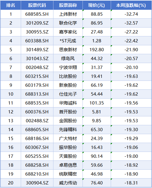 而本周个股跌幅榜前五位分别是上纬新材、联合化学、嘉亨家化、*ST元成、思泉新材,累计跌幅分别为32.74%、32.57%、27.22%、22.42%、21.90%。这些个股的下跌可能与公司业绩不佳、行业前景黯淡等因素有关。其中,上纬新材主营环保高性能耐腐蚀材料、风电叶片用材料、新型复合材料的研发、生产和销售;联合化学主要生产各种高性能有机颜料,是国内外颇具影响力的有机颜料供应商;嘉亨家化是一家专业从事日化产品OEM/ODM及塑料包装容器的研发和生产的综合性服务企业。