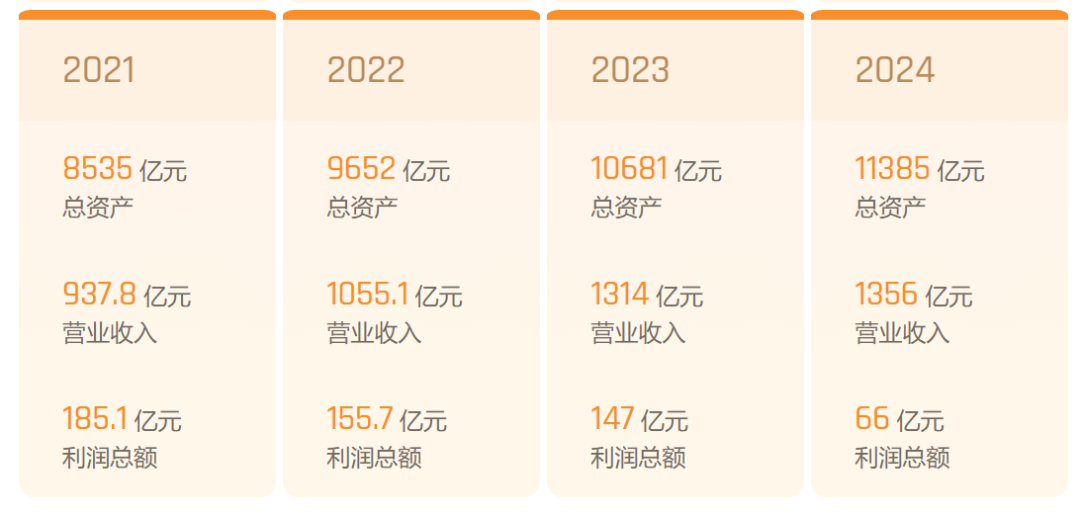 数据显示,越秀集团正面临着盈利增长的压力。2021年至2024年间,虽然其营业收入持续增长,到2024年已达1356亿元,但利润总额却出现了明显的下滑,2024年仅为66亿元,仅为2021年的三分之一。