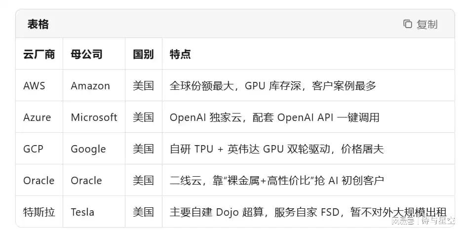 一句话总结:训练/推理算力被“美系四云”垄断,Oracle 和特斯拉是细分/自用搅局者。