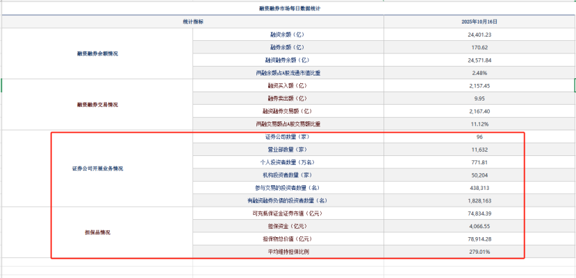 截至10月16日,两融市场参与者结构呈现新特征:个人投资者达771.81万名,机构投资者5.02万家,当日参与交易的投资者43.83万名,平均维持担保比例维持在279.01%的健康水平。这些数据表明,市场风险承受能力整体稳定。