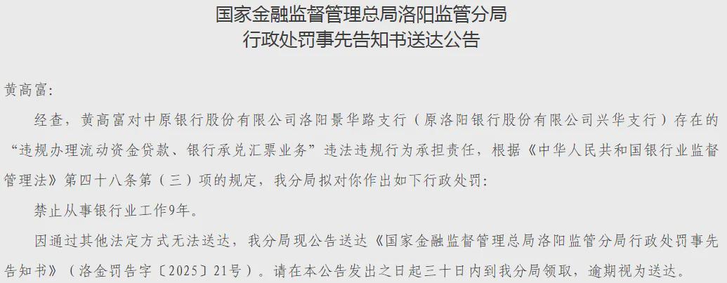 近日,中原银行洛阳景华路支行因“违规办理流动资金贷款、银行承兑汇票业务”被监管部门罚款40万元,时任客户经理黄高富被禁止从事银行业9年,另一名客户经理张晓梅受到警告。无独有偶,10月9日,该支行因同一原因再次被罚40万元,客户经理路黎明被禁业5年。
