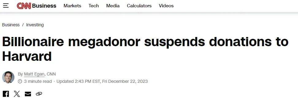 更雪上加霜的是,巴以冲突引发的“反犹主义倾向”争议导致部分亿万富翁捐赠者公开批评哈佛,甚至暂停捐款。对冲基金经理比尔·阿克曼等校友的撤资行动,进一步加剧了捐赠收入的萎缩。