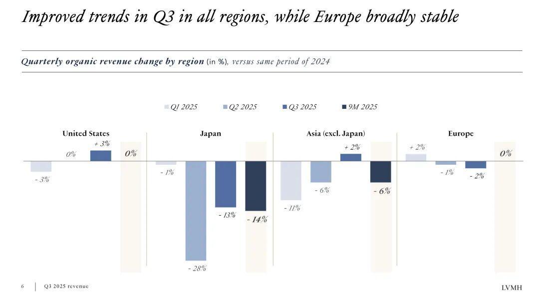 在地区分布上,LVMH集团在财报中指出,亚洲市场中,除日本市场外,亚洲其他地区相较2024年呈现明显回暖态势。具体来看,第三季度,美国市场营收同比增长3%,受到客流量和销量的提升驱动影响。而欧洲下降2%、日本下降13%,亚洲(不含日本)则增长2%。LVMH解释称,日本去年基数较高,今年已回归常态,美国游客则因美元走弱,在欧洲的消费有所减少。