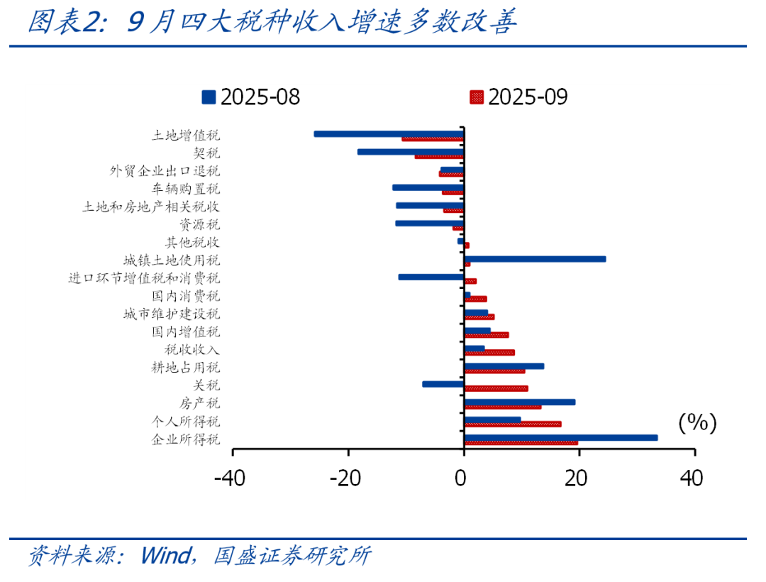 9月一般财政收入增速显著抬升,其中税收收入改善是主要支撑力量,而非税收入降幅则进一步走扩,已连续5个月呈现负增长态势。具体来看,9月一般财政收入达到1.57万亿,同比增长2.58%,较上月抬升0.55个百分点。其中,税收收入为1.16万亿,同比增长8.7%,较上月大幅抬升5.3个百分点;非税收入则为4099亿,同比下降11.4%,连续5个月呈现负增长。