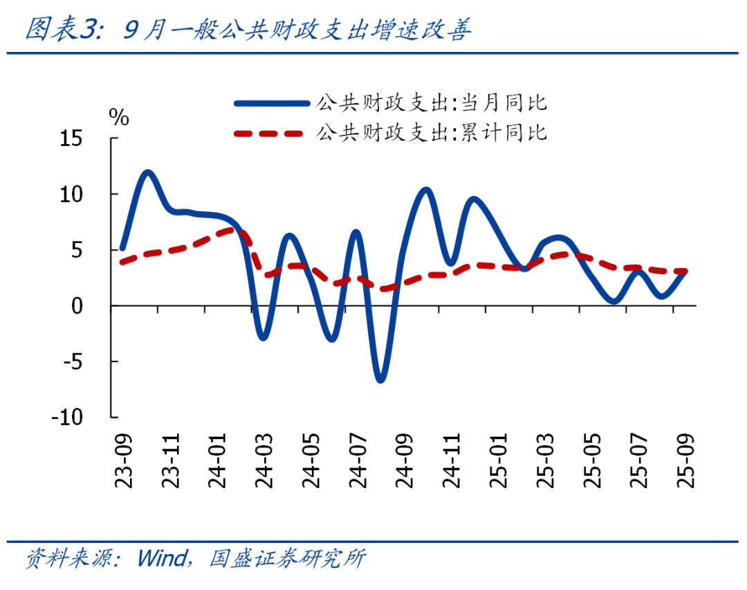 2025年1-9月,我国一般财政收入累计达到16.39万亿,同比增长0.5%,相较于1-8月的0.3%有所提升;9月单月一般财政收入为1.57万亿,同比增长2.58%,高于8月的2.03%。同期,一般财政支出累计为20.81万亿,同比增长3.1%,与1-8月持平;9月单月一般财政支出为2.87万亿,同比增长3.08%,较8月的0.82%显著加快。国盛证券首席经济学家熊园指出,9月财政数据呈现喜忧参半的态势,年内一般财政预算基本能够完成,但受土地出让收入拖累,政府性基金可能存在约3700亿的缺口。10月17日财政部发布会宣布将继续盘活5000亿地方政府债务结存限额,并叠加政策性金融工具,有望在一定程度上弥补政府性基金的收支缺口。展望2026年,预计总赤字规模将不低于今年,赤字率很可能维持在4%左右或略高,且化债额度和专项债额度已部分提前下达,指向财政节奏有望前置。