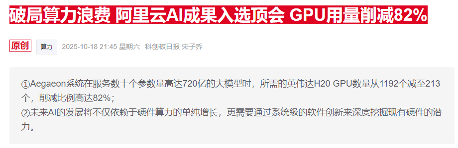 • 近日,阿里云提出的计算池化解决方案“Aegaeon”成功入选顶级学术会议SOSP 2025,该方案可解决AI模型服务中普遍存在的GPU资源浪费问题,Aegaeon系统在服务数十个参数量高达720亿的大模型时,所需的英伟达H20 GPU数量从1192个减至213个,削减比例高达82%。